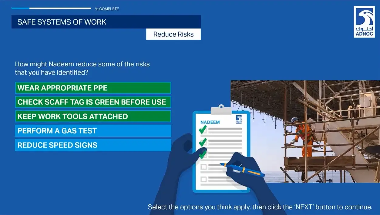 Low-stakes assessment section in SHIIFT’s eLearning induction course created for ADNOC