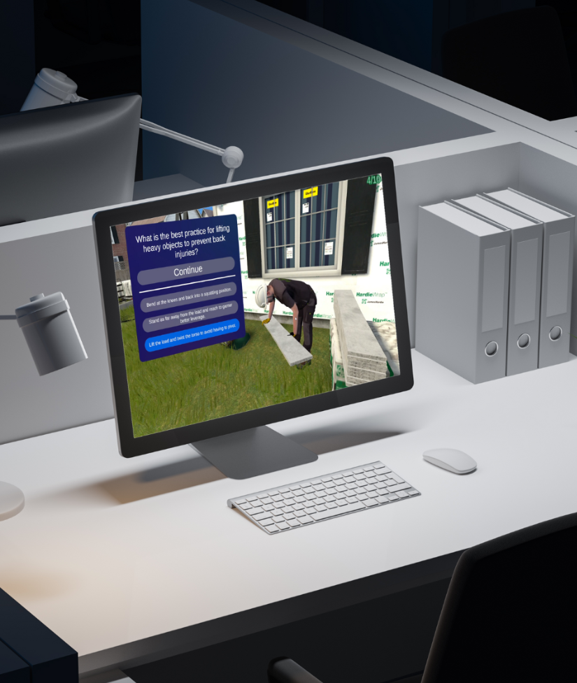 Music isn’t commonly seen in training, since most simulations focus their soundtracks fully on being immersive and so there’s not always room for music. In James Hardie’s Jobsite Safety Training, we use an ambient music style that plays ‘in the background’ via a radio that’s on the Job Site. In real life, not all job sites will allow music, but this was a way to include music which can help a lot with keeping users engaged in the training, while still being immersive as the sound comes from a radio on the Job Site.