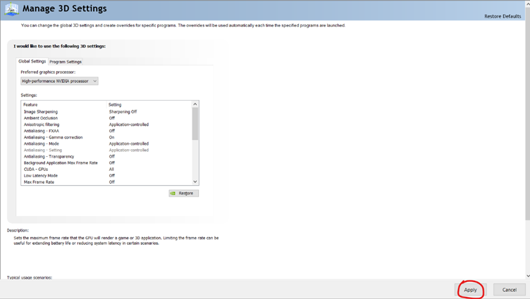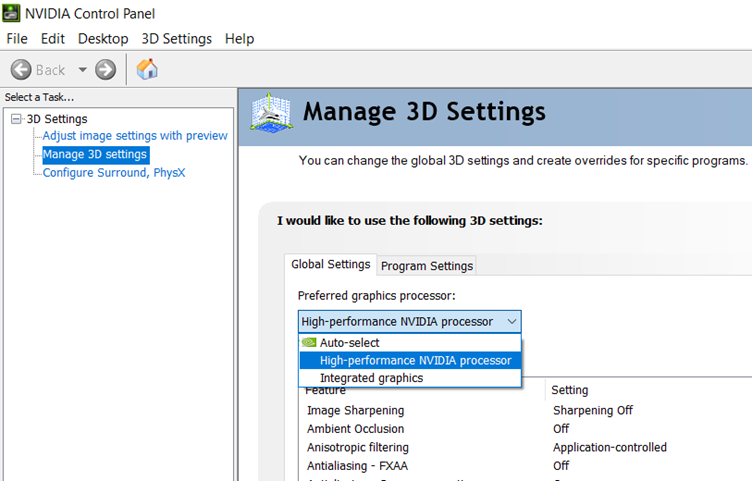 4.4. Under the global settings tab, click on ‘Preferred graphics processor:’ and select ‘High-performance NVIDIA processor’.